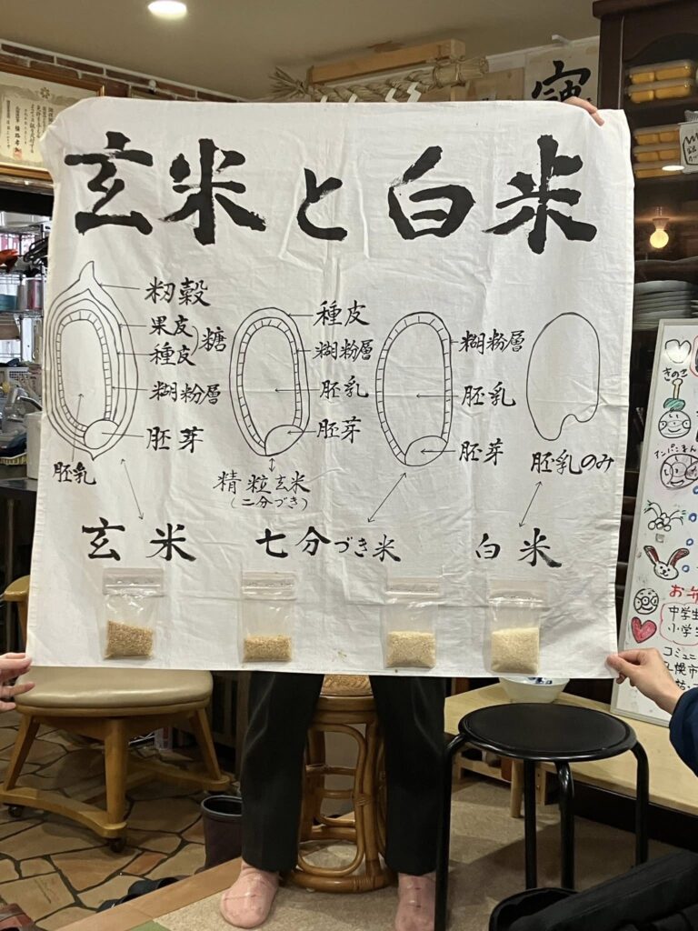 その後は雑談タイム。玄米の栄養の話になり、紫苑のオーナーさんが玄米と白米の違いを絵を使って教えてくれました。初めて知ることも多く、みなさん興味深く聞いてました。