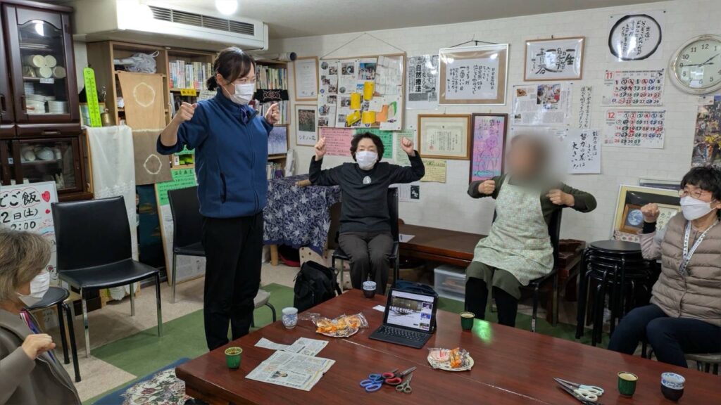 せっかくなので、何か一緒にできる体操を相談。「北国の春」の歌に合わせてできる体操を教えてもらい、一緒に行ってみました。歌を口ずさみながらの体操は、いつもより楽しく体を動かすことができました。