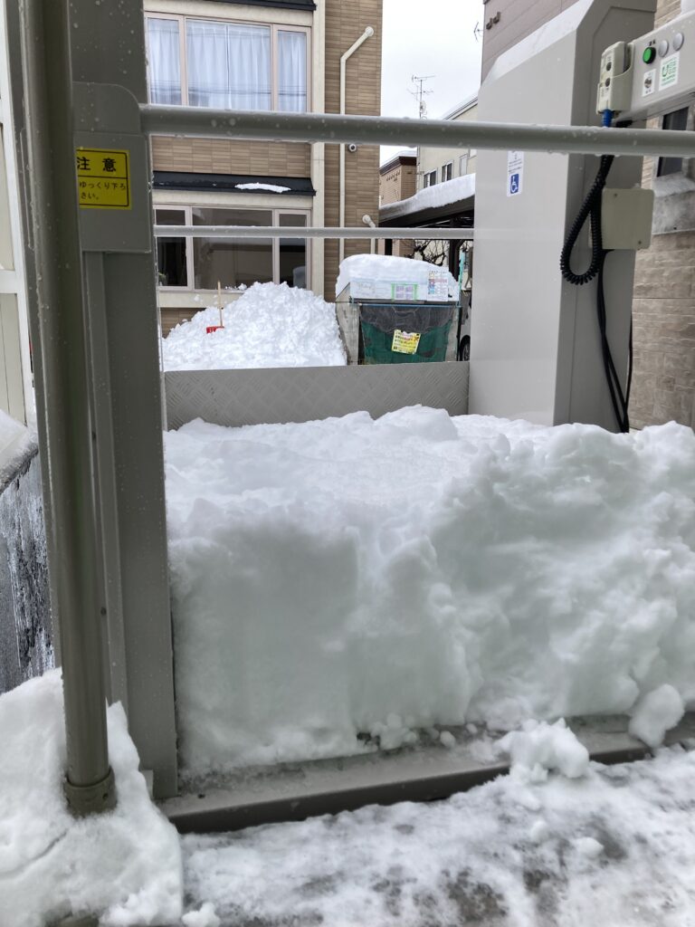 昨夜から降り積もった雪は12月には珍しい大雪となり、昇降機にも降り積もりました。雪国を実感。