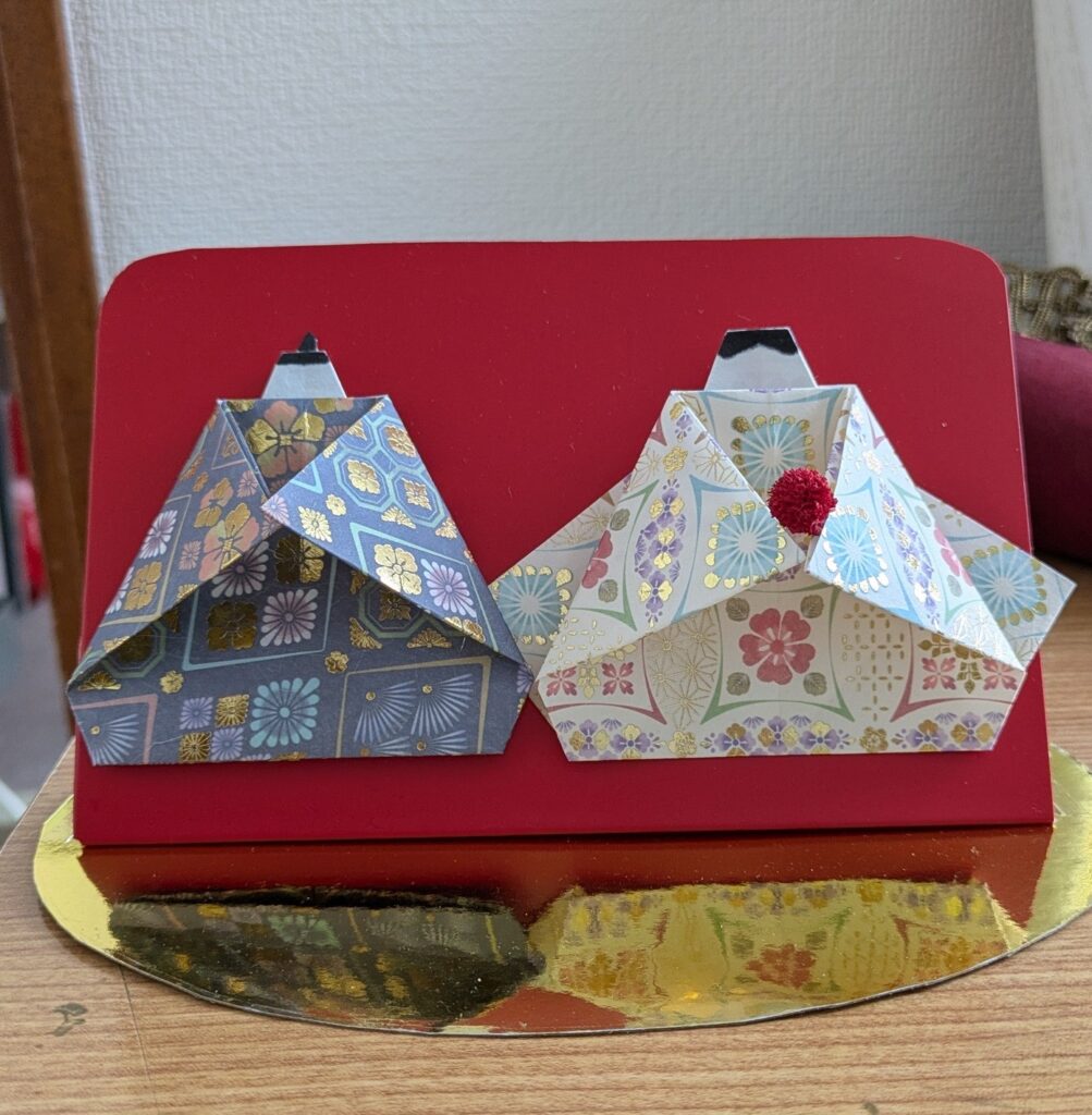 「どんな着物の柄にしようか」と出来具合を想像しながら選び、お内裏様とお雛様をそれぞれ折りました。